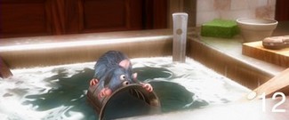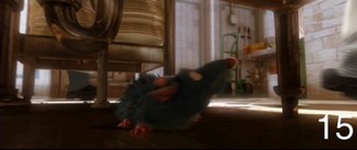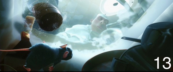 S’ensuit un plan de « respiration » lorsque Remy atterrit dans l’eau du lavabo (image 11), petit moment de suspension où la musique s’atténue pour nous permettre d’assimiler la nouvelle situation et de laisser notre esprit s’emballer. Le danger de l’environnement s’affirme dans les deux plans suivants. Remontant à la surface, Remy doit trouver son équilibre sur un ustensile (image 12). Mais l’approche d’un cuisinier l’oblige à replonger sous l’eau. La menace est donc double : venant autant de la pièce que de ses occupants, ce qui se recoupe ensuite dans un plan en contre-plongée. Présentant jusqu’ici le personnage comme un dominant, il le met désormais dans un état de faiblesse. Sous l’eau, il ne voit plus le cuisinier comme un petit pion mais comme un titan monstrueux (image 13). Il ne peut pour autant pas se laisser noyer et commence ainsi une cavalcade.