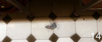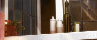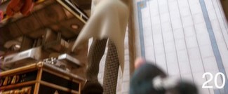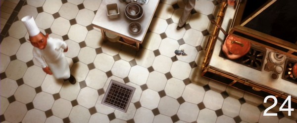 Ironiquement, Bird incorpore un plan qui devrait nous repositionner dans l’espace mais qui se révèle sans valeur. Remy est au milieu du cadre et on voit vers quelle direction il se dirige (image 23), mais le plan n’offre pas plus d’informations sur son emplacement et ses possibilités d’évasion. Finalement, le personnage n’aura fait que tourner en rond mais la compréhension de ce mouvement en spirale importe peu ici. Ce qui compte est le sentiment de Rémy vis-à-vis de ce mouvement et il se résume simplement dans ses faibles chances de survivre longtemps à ce traitement. L’action se termine par un plan en plongée nous donnant une vue d’ensemble sur la glissade de Rémy (image 24). Par rapport à ce qui été dit plus tôt, celui-ci fait surtout office de ponctuation pour remettre en avant que Remy n’a pas sa place dans l’univers géométrique de la cuisine.