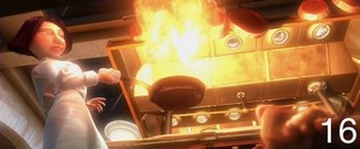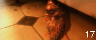 S’extirpant de l’évier, Rémy tombe encore un peu plus bas. Il est cadré au centre de l’image et le mouvement en plongée renforce l’idée que sa fuite peut se faire dans n’importe quelle direction (image 14). Cependant, Remy est dans un tel état de panique qu’il se soucie peu de la direction dans laquelle il cavale. Au cours de sa carrière, Bird a constamment fait preuve de rigueur dans la construction géographique de ses séquences et la disposition de chaque élément. Pourtant, cette donnée est très fragmentaire dans le cas présent. Cela est cohérent par rapport au point de vue de Rémy. S’il a exprimé à distance une maîtrise dans l’organisation de la cuisine, il ne voit plus qu’un environnement de danger lorsqu’il y prend pied. La théorie s’efface devant la pratique et cela se traduit par une sérieuse désorientation, ce que le découpage cultive. Au moment où Rémy court, la caméra abandonne son côté paisible et les mouvements deviennent plus véloces pour se mettre en accord avec l’anxiété qu’on lit sur son visage (image 15). Il se dirige à la gauche du cadre mais la caméra panote et lui montre une irruption de flamme qui lui fait prendre peur (image 16). Là encore, on note le changement de valeur dans la contre-plongée. Bien que toujours au premier plan, Rémy est maintenant dominé par les humains. Bird amplifie l’idée dans un contre-champ débutant par une vue en plongée écrasant le personnage autant que l’éruption de couleur orange (image 17). Cela enclenche son déplacement contraire vers la droite du cadre. Bird choisit ce moment pour nous déboussoler.
