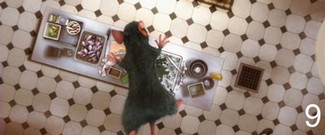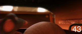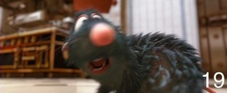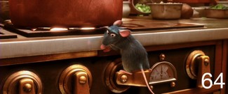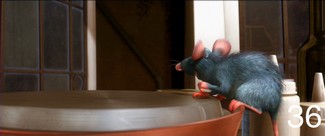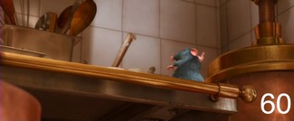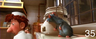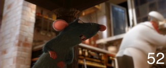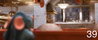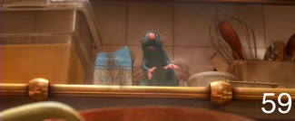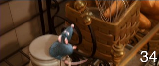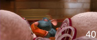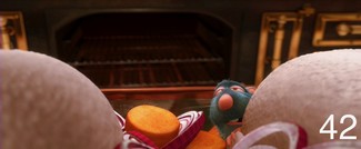 Après avoir réévalué la distance à parcourir (image 39), Remy saute précipitamment dans un plat. Distrait par la senteur des ingrédients (image 40), il ne perçoit pas que le plat est prêt à être enfourné. Tout comme il s’est jeté dans le plat pour ne pas être remarqué, il s’inquiète dans le plan suivant de la présence du cuisinier sans véritablement saisir l’action que celui-ci accomplit (image 41). Afin de rappeler que la cuisine impose son mouvement à Rémy, la caméra est accrochée au plat qui entre dans le four (image 42).