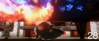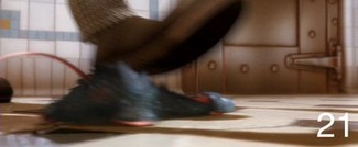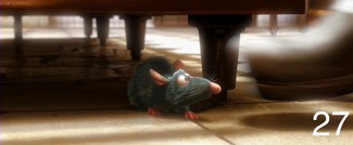 Remy comprend que la solution ne se trouvera pas dans l’affolement. Il se calme donc quelques secondes (image 25), ce qui lui permet d’identifier une issue. Comme antérieurement, la vue subjective et le zoom montrent que toutes ses pensées se projettent vers cet objectif (image 26). Celui-ci lui apporte de la confiance et il se lance cette fois-ci avec précaution dans la traversée. Mais l’entrée dans le champ d’une chaussure lui coupe la route et compromet tous ses plans (image 27). En dépit de ce qu’il veut, la cuisine suit son propre rythme. Qu’il pratique un tempo rapide ou lent, cela ne change rien au fait que Rémy ne s’y accorde absolument pas. L’allumage du four le propulse ainsi dans la direction opposée (image 28).