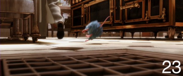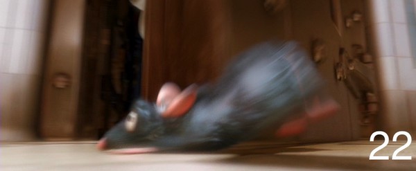Alors que Remy regarde derrière lui, Bird brise la règle des 180 degrés et donne le sentiment que le personnage se dirige à nouveau vers la gauche (image 18 & 19). La perte de repère est d’autant plus instantanée que le surgissement d’un cuisiner (image 20 & 21) puis l’ouverture d’une porte (image 22) renvoient d’un coup Rémy vers la droite du cadre.