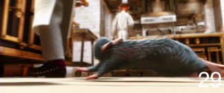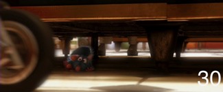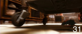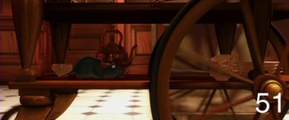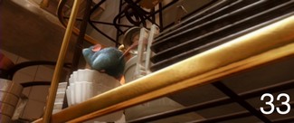 Afin de signifier une panique mieux contrôlée, Bird filme la nouvelle galopade de Rémy selon un angle latéral (image 29). Même s’il se déplace en vitesse, le réalisateur souligne que Rémy essaie d’être plus attentif à l’environnement, ce qui introduit son regain de courage dans le plan suivant. Alors que sa route est coupée par un chariot (image 30), il met de côté sa peur et prend l’initiative de se glisser en dessous (image 31). Remy choisit de ne pas aller à l’encontre du mouvement de la cuisine mais à l’inverse d’en tirer partie. Le résultat est une réussite puisqu’il se rapproche énormément de la fenêtre (image 32).