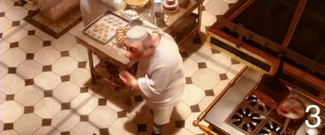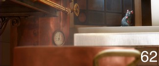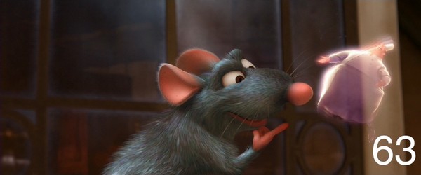 Sautant vers la fenêtre, on le voit satisfait. Centré et en gros plan (image 61), il redevient lui-même et il jette un regard en arrière en caressant ses rêves (image 62). On ne s’étonne pas de voir réapparaître Gusteau. Alors qu’il était tout à l’heure à sa droite le poussant vers la cuisine, il fait de même en surgissant sa gauche (image 63). Bird utilise ainsi bien Gusteau dans sa fonction de conscience chargée d’encadrer le personnage dans ce qu’il veut être.