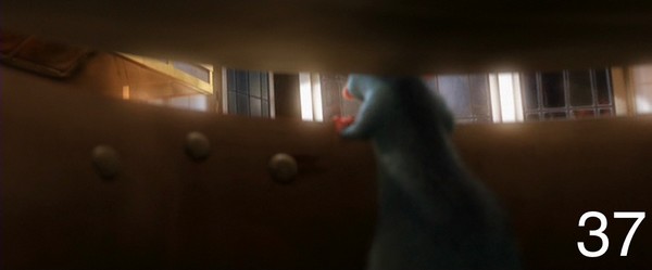 Le sentiment de victoire est renforcé par le choix de ne faire qu’un plan très fluide entre le moment où Rémy saisit sa chance en s’infiltrant sous le chariot et son accès aux étagères lui offrant un peu de sécurité. Cette fluidité est maintenue dans les plans suivants (image 33 à 36) jusqu’à ce que Rémy soit juste à côté de la fenêtre… et rattrapé par la mécanique de la cuisine.