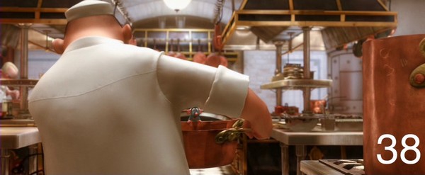 La désillusion passe par un champ-contrechamp alternant autant les points de vue que leurs dimensions. Tombé au fond d’une casserole, Rémy voit l’issue s’éloigner de lui (image 37). Le contrechamp sur le cuisinier transportant l’ustensile nous donne une vision plus large de la pièce (image 38). De nouveau, Rémy, apparaît fort petit dans cette gigantesque organisation et il n’est pas au bout de ses peines.