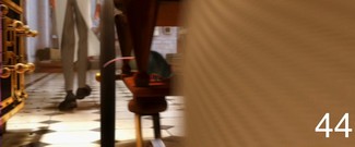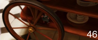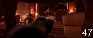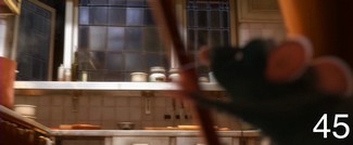 La suite joue alors sur la lutte entre Rémy et les forces de la cuisine. Dès que le plat est mis au four, Remy reprend en quelque sorte le contrôle du mouvement et tout logiquement la caméra le suit (image 43). Embarqué à bord du chariot à fromage (image 44), la caméra conserve son point de vue quand il passe à proximité de la fenêtre (image 45). Son regard reste fixé sur cette sortie dont il s’écarte faute de pouvoir empêcher le mouvement du chariot. Une nouvelle fois, l’insertion d’un contrechamp plus distancé permet de présenter le personnage dans toute son impuissance (image 46). Bird peut passer sur son visage désespéré quand il entre dans un territoire inédit : la salle de réception.
