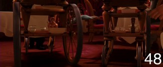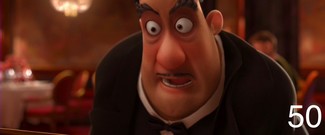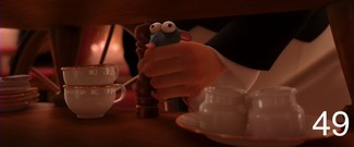Plutôt que de réitérer son jeu d’échelles par rapport à cette nouvelle ambiance, Bird va se reposer sur la musique de son fidèle collaborateur Michael Giacchino. Alors que la musique orchestrale extra-diégétique portait la séquence, la musique devient intra-diégétique. La reprise du thème principal assure la continuité mais son instrumentalisation épurée rompt avec l’énergie déployée jusqu’alors et crée une gêne. Ce qui est logique de par la double perception de la salle pour Rémy. C’est un environnement plus peuplé, plus exposé et donc plus dangereux à la fois au regard de sa condition de rat et son ambition de chef (image 47). Instinct de survie et rêves gastronomiques le motivent à se détourner de ce lieu où il n’a rien à faire. Le crochet dure d’ailleurs un battement de cil, Rémy profitant de la valse de la restauration pour revenir illico dans la cuisine (image 48). Si Bird s’attache tout le long de la séquence à suivre le point de vue de Rémy, il se permet une petite entorse en insérant un plan sur un serveur qui était à deux doigts de la débusquer (image 49 & 50). Il souligne à quel point le danger est plus près que jamais dans ce lieu à éviter. On peut aussi y voir une manière de jouer sur les attentes du spectateur, ce passage ayant servi au teaser mais avec une conclusion très différente.