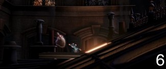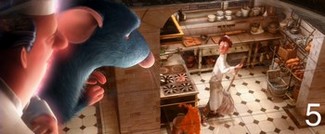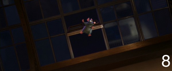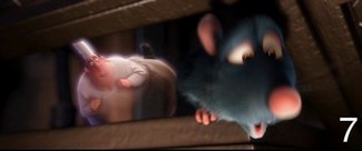 Les choses évoluent néanmoins lorsque la conscience de Remy le mène à considérer le cas de Linguini. Il le fait avec un profond dédain, le jugeant comme un futile plongeur incapable de cuisiner. Bird insère un plan sur Remy et Gusteau sans la séparation de la fenêtre et brisant légèrement la contre-plongée (image 4). Une façon de rappeler que Rémy est mal placé pour proférer une telle opinion, ce que l’emballement des évènements à suivre va démontrer. Bird abandonne à cette occasion la vue subjective lors des plans en plongée en réunissant Remy, Gusteau et Linguini dans le même cadre (image 5). Cela lui permet de faire un zoom quand Remy constate que Linguini trafique la soupe suite à une maladresse. Après cet effet dramatique, Bird opère un plan en extérieur changeant totalement l’axe de caméra utilisé jusqu’à présent (image 6). Le plan plus large révèle à quel point, tout érudit qu’il est, Remy demeure un rat petit et impuissant. Comme le zoom l’appelait à aller au plus près de la catastrophe, Rémy s’approche de l’ouverture de la fenêtre. La séparation du grillage est définitivement abolie et son destin peut alors basculer (image 7).