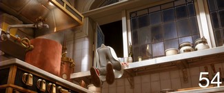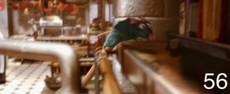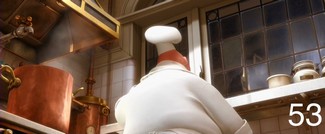 Ici, nous retournons dans la cuisine (image 51). De nouveau, la vue latérale sur Rémy accentue son attention sur l’environnement et il se réfugie en conséquence avec aisance dans la zone près de la fenêtre (image 52). Il se produit alors un évènement qui le relègue au rang de spectateur : un cuisinier ferme la fenêtre qui était sa seule issue (image 53). Puis Linguini arrive, goutte à sa soupe trafiquée et rouvre la fenêtre pour tout recracher dehors (image 54). La péripétie semble juste ajouter une dose anodine de suspense à la séquence, mais elle n’a en fait rien d’accessoire. Elle participe au contraire à la caractérisation de Linguini et de sa future relation avec Rémy. Linguini est responsable de la situation périlleuse dans laquelle se trouve Rémy et ironiquement il lui apporte à cet instant la solution. Comment a-t-il fait tout ça ? En parasitant la mécanique de la cuisine, signifiant son statut de pièce rapportée qui n’est pas à sa place. Mais nous y reviendrons plus tard. Pour l’heure, Rémy galope vers la liberté.