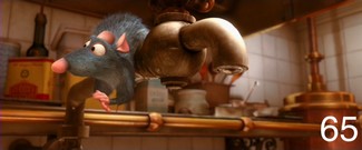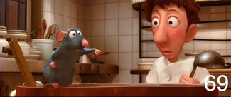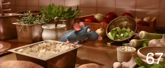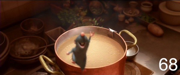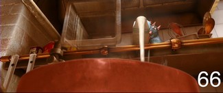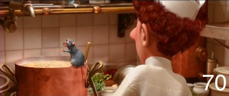 L’apothéose est un plan en plongée sur la marmite avec un hypnotique mouvement circulaire (image 68). Toute l’attention de Rémy est aspirée dans la concrétisation de sa vocation. Il en oublie le monde extérieur qui s’obscurcit petit à petit… jusqu’à se rallumer lorsque Linguini le surprend (image 69). Les deux personnages principaux sont présenté comme égaux en occupant chacun une moitié équivalente du cadre. Mais cet équilibre est brisé par le contrechamp rappelant que Rémy est un être incongru dans une cuisine (image 70).