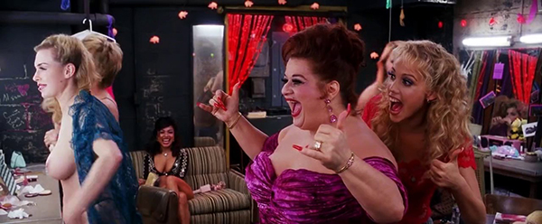 Du statut de voyeur intrigué, le spectateur devient vite le témoin révulsé de ce vaste Disneyland de la vulgarité, à la fois kitsch et sordide, où vendre son cul revient à vendre son âme. Tout, ici, pue la vulgarité et le faux-semblant, et tout au long du film, les exemples ne manquent pas : l’arrivée d’une nouvelle danseuse dans un peep-show ressemble au début d’un engrenage vers la prostitution (sécheresse du patron, règles à respecter, fric à tirer, sans oublier le droit de cuissage aléatoire), le grotesque s’invite au détour d’un numéro où le talent d’une danseuse obèse se limite à débiter des obscénités et à faire surgir des nichons gigantesques (avec un bruit de serpentin en fond sonore !), les spectacles de charme qui font la réputation de Las Vegas vont du tableau des Enfers en carton-pâte jusqu’à des chorégraphies hardcore dignes d’un porno SM, l’existence de chacun est déterminée par la capacité à savoir se donner en spectacle (et si ça ne marche pas, c’est un aller simple vers la déchéance sociale), et au vu du ridicule explicite des peep-shows où les clients veulent sans cesse en voir plus, Verhoeven s’amuse même à faire sortir de la bouche d’un client japonais « En Amérique, tout le monde est gynécologue ». A un moment-clé du film, il se permet même une idée de mise en scène géniale : sur un décor de spectacle désert, Nomi fait part à Zack des soupçons de prostitution dont elle a eu vent et ce dernier lui promet de corriger cela, mais dès que le décor se met à s’animer (avec la musique tonitruante et les éclairages flashy), Zack passe un coup de téléphone et l’on comprend alors que cette promesse n’était que du vent. Le spectacle doit continuer, peu importe le prix, peu importe les scandales.