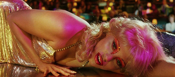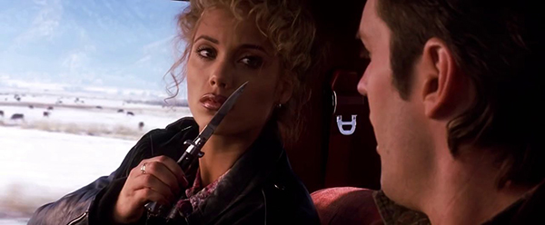 La structure narrative du film pose d’emblée les bases du processus vicieux et manipulateur orchestré par Verhoeven sur les codes de la success-story traditionnelle. Le début du film est édifiant : pas de générique (à part le titre du film, très sobre et non stylisé), aucune présentation du contexte, juste une jeune femme nommée Nomi Malone (Elizabeth Berkley) qui fait du stop sur le bord d’une route. Une jeune femme lookée à la manière d’une serveuse texane un tantinet vulgaire, qui embarque dans la voiture d’un type désireux de se rendre à Las Vegas. Le début d’une nouvelle vie pour elle ? On n’en sait rien, et à vrai dire, on est même plutôt curieux : à peine le conducteur se livre-t-il à une gentille tentative de drague que la miss le menace avec un couteau rétractable sorti de sa poche, et tout ce que l’on perçoit d’elle, qu’il s’agisse de son franc-parler hystérique, de son maquillage assez vulgos et de ses goûts musicaux (un coup sur l’autoradio pour mettre du hard-rock), est très éloigné de la jeune fille innocente que n’importe quelle success-story se doit en général de présenter en intro. Sans parler d’un mystère narratif sur lequel le film, finalement très mutique sur le véritable passé de Nomi, lèvera toute zone d’ombre au cours de la dernière demi-heure du film. Pourtant, les premiers pas à Las Vegas servent assez fidèlement les étapes classiques du mélodrame que la success-story se plait souvent à évoquer : Nomi se fait voler sa valise contenant toutes ses affaires, trouve refuge chez une fille rencontrée sur un parking, tente de faire face à ses problèmes financiers en jouant les effeuilleuses dans une boîte de striptease, et désespère de voir un jour le succès frapper à sa porte lorsqu’elle contemple les shows survoltés qui font le sel de Las Vegas. Fausse impression, puisque si le hasard entre souvent en jeu dans l’ascension de Nomi vers les étoiles, c’est très souvent elle qui le provoque. On le devine très vite : Nomi est tout sauf une innocente oie blanche. C’est surtout une vraie manipulatrice. Son corps est son arme, le sexe est son passeport vers une quête de pouvoir toujours plus folle.