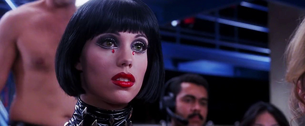 Ainsi donc, dans un premier temps, ravi de pouvoir balancer du sein et de la fesse dans tous les recoins de l’image sans craindre l’intervention des sécateurs de la censure, Verhoeven ose tout : des lapdances racoleuses, des spectacles d’un kitsch écœurant, une musique tonitruante de Dave Stewart (la moitié du duo Eurythmics) pour étayer les scènes de topless, sans oublier une scène de baise anthologique dans une piscine (que même Loana et Jean-Edouard ont été incapables d’égaler !). Et dans un deuxième temps, le cinéaste quitte le spectacle pour fouiller très loin dans les coulisses de ce monde de paillettes, avec, comme point d’orgue de ce démontage, une horrible scène de viol dans les coulisses d’une soirée luxueuse qui suffira à faire débander le spectateur. Encore et toujours cet aller-retour entre le faux et le vrai, entre les paillettes et le sordide, entre l’excitation et le sadisme, avec la volonté de faire la lumière sur une réalité désagréable que beaucoup ne veulent pas voir en face. Cela amène du coup un autre niveau de lecture, peut-être plus logique au regard de la carrière de Verhoeven dont les films ont toujours été travaillés par la symbolique chrétienne. Si l’on regarde bien sa filmo, les héros de ses films ont très souvent été déchirés entre le paradis et l’enfer, et comme on a pu le voir précédemment, Nomi n’échappe pas non plus à cette dualité : son ascension de l’univers des peep-shows jusqu’aux starlights traduit la mutation progressive d’une nantie en déesse. Preuve en est l’instant où elle prend la place de Cristal dans le spectacle : la voilà qui jaillit d’un volcan en feu, les bras en croix, comme ressuscitée. On peut y voir une analogie avec le personnage d’Alex Murphy dans RoboCop, qui mourait « crucifié » sous les assauts des bad guys avant de ressusciter sous un endosquelette de métal. Ça, c’est pour la symbolique.
