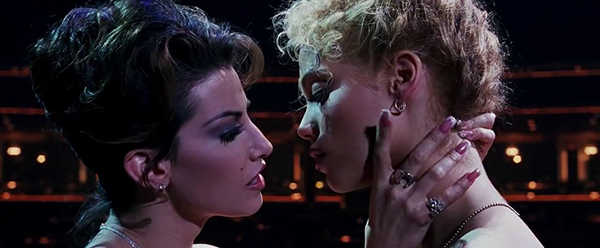 Après, il y a l’autre face cachée de ce niveau de lecture, puisque, tout au long de Showgirls, le parcours de l’enfer vers le paradis n’est qu’une illusion : aussi rêvé et lumineux soit-il, le paradis n’est que le prolongement de l’enfer, où le pouvoir, la drogue, le sexe et le viol peuple chaque strate du monde du spectacle. La première découverte du spectacle où se produit Cristal, à base de visions infernales et de costumes scintillants sur un décor en carton-pâte couvert de lave artificielle, était déjà un avertissement, mais Nomi, sans doute aveuglée par sa quête de pouvoir et la luminosité des paillettes, s’en sera rendue compte beaucoup trop tard. Elle devient malgré elle une sorte de Judas, ayant trahie celle qui avait tous les pouvoirs (Cristal) pour prendre sa place, et donne finalement à celle-ci un ultime baiser avant de s’échapper pour de bon de ce vaste jardin des perversités. Et c’est dans cette ambiguïté interne que le jeu d’Elizabeth Berkley, que beaucoup ont jugé grotesque et hystérique, se révèle au contraire brillantissime, tant son incarnation de Nomi est à l’image du film : cachant bien son jeu sous une enveloppe excitante, suscitant le désir comme les moqueries chez ceux qui la contemplent (il suffit d’entendre comment elle prononce le mot « Versace »), et ressuscitant au final sous une forme éclatante, même si le poids des dégâts continue de flotter au-dessus de sa tête. Comme quoi, en cherchant à stigmatiser de l’intérieur la vulgarité du monde du spectacle, Paul Verhoeven a finalement réussi un grand film métatextuel, pervers et élégant. Sacrée audace.