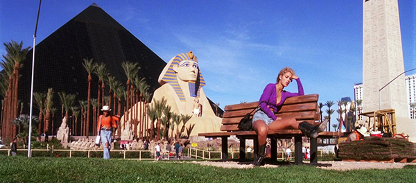 Cet enfer, Nomi aura eu tout le temps de l’apprivoiser pour savoir en maîtriser les règles. Si son ambition est déjà très forte, elle prend un relief plus élevé à l’apparition de Cristal Connors (Gina Gershon), danseuse bisexuelle et star absolue des shows spectaculaires de Las Vegas, avec laquelle le premier contact sera électrique : évoquant son souhait de devenir une danseuse professionnelle, Nomi se prend une sacrée baffe lorsque Cristal lui révèle que jouer les effeuilleuses dans un bar minable ressemble surtout à de la prostitution. La provocation entre les deux femmes s’intensifie encore lorsque Cristal débarque au bar de Nomi avec son petit ami Zack (Kyle MacLachlan) et lui réclame une lapdance. Grâce aux hallucinants déhanchés d’Elizabeth Berkley, la scène est d’une sensualité démente, mais d’une autre côté, elle s’apparente surtout à un nouveau stade de manipulation de la part de Nomi, d’une part pour accroître son sentiment de mener le jeu avec quiconque tente de l’aborder, d’autre part pour y voir une possible audition pour intégrer le spectacle de topless dans lequel Cristal se produit (on apprendra peu après que Zack en est l’un des managers). En outre, cette scène illustre aussi la schizophrénie volontaire du film en général : excitante au premier regard, dérangeante si l’on gratte le vernis des apparences. L’un des plus brillants tours de force de Verhoeven est de jouer sur ce passage progressif d’un état vers l’autre, de jouer un peu malgré lui avec les appréhensions du spectateur, et pour cela, le simple décor du nouveau Las Vegas suffisait amplement : le cinéaste permute les différentes composantes de cette ville hallucinante, sorte d’îlot paradisiaque perdu dans un désert infini, et au sein duquel se concentrent toutes les perversités.