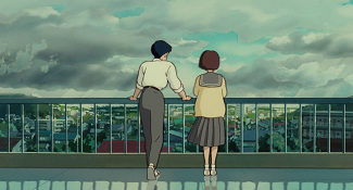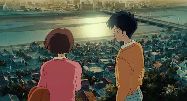 Ensuite, cette introduction nous offre une vue contemplative de la ville. Aux compositions centripètes suggérant qu’un ailleurs est impossible, Yoshifumi Kondô répond par une large exploration de la ville, sublime, imposante, inspirante, bien aidé par Hayao Miyazaki au storyboard, la posant comme un personnage à part entière et comme partie d’un tout plus vaste encore. Par-là, le duo amorce le thème de l’ouverture au monde nécessaire à toute construction identitaire, thématique majeure dans l’évolution à venir de Shizuku. Ce genre de panorama sera par ailleurs l’un des piliers du projet de mise en scène du film : ces vues pousseront ceux qui y feront face à une introspection salutaire, autant qu’ils leur donneront l’inspiration qui les fera avancer.