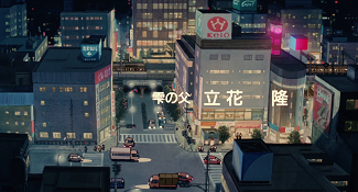 Prenez la toute première scène du film. À la suite d’une ouverture au noir, un panoramique relie le ciel à la terre alors que débute une mélodie enchanteresse. L’écran-titre apparaît et les crédits se suivent au gré d’une caméra scrutant divers environnements d’une ville que l’on devine moderne, compte tenu des nombreuses lumières, de phares, de lampadaires, de commerces, qui l’éclairent dans la nuit. Adoptant plusieurs points de vue, la caméra scrute la ville avant de la contempler en reprenant de la hauteur, abordant au passage des personnages majeurs du récit, comme si elle semblait explorer les lieux à la recherche de quelque chose… ou plutôt de quelqu’un, en l’occurrence Shizuku, que la caméra ne quittera plus sitôt celle-ci apparue dans le champ.