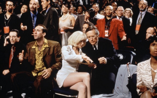 Une fois la panique maîtrisée et le décor verrouillé, De Palma fait de son intrigue un retour permanent sur l’action dont le spectateur a été le témoin privilégié durant ces vingt premières minutes scotchantes. Dès lors, le décor devient une prison dorée dont la caméra va triturer chaque recoin sans se préoccuper des lois de la physique, et où le spectateur, tout comme le héros, va voir ses certitudes tomber à plat une par une. Le héros du film, parlons-en justement, puisqu’il semble très éloigné de ce à quoi sa fonction devrait le cantonner : supposément regard subjectif du spectateur plongé dans une intrigue/enquête aux enjeux qui le dépassent, Rick Santoro est avant tout un véritable antihéros, flic corrompu jusqu’à la moelle, dévoré par une irrépressible envie de pouvoir et de célébrité, et dont la seule optique de contrôle réside dans la manifestation de soi-même. Pas étonnant que le côté « cabotin » d’un acteur comme Nicolas Cage fasse ici des merveilles : Santoro fait sa première apparition sur un écran de télévision où se profile l’imminence d’une émission en direct (il semble debout devant un public survolté, mais il est juste un guignol qui gesticule devant un fond vert), il capte le regard et l’attention de ses semblables et de ses témoins dès que ses facultés de manipulateur (de comédien ?) s’intensifient, et sa faculté à tout contrôler (le plan-séquence d’ouverture en donne une idée très précise) lui donnerait presque l’allure d’un démiurge possédant les clés de son propre univers. Pas de chance pour lui : cette soirée de pur spectacle sera l’occasion d’abattre ce château de cartes a priori indestructible, d’orchestrer une authentique tentative de rédemption en direct-live. Et comme la vérité se dérobe sans cesse dans cette enquête dont il va devoir être le meneur malgré lui, il va patauger, tenter d’orienter son raisonnement vers d’autres pistes, explorer chaque recoin et chaque possibilité. Sauf qu’il se trompe sans arrêt : même si son enquête le mènera au final vers la mise en lumière d’un complot et l’identification finale du tueur, il n’aura de cesse que de rester sur une piste criminelle qu’il impose aux autres et à lui-même, sans savoir que la vraie « vérité », si inavouable qu’elle ne peut être dans son champ d’action, est toujours à portée de vue. Le spectateur, lui, aura toujours un temps d’avance sur lui. Pour autant, la vérité ne pourra éclater que par l’intermédiaire d’un seul médium, détenteur absolu de l’événement immortalisé : l’image.