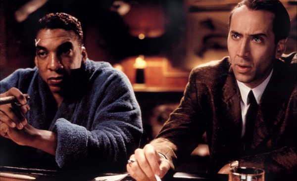 Même si l’enquête progresse plus vite grâce aux perspectives offertes au spectateur par la caméra du cinéaste (on saura très vite ce qui se cache derrière toute cette histoire), Snake eyes ne perd jamais en intérêt. On le répète : Brian De Palma n’est jamais autant meilleur que quand il se concentre sur son propre style, sur la dimension externe du processus narratif et stylistique qu’il se plait à mettre en place. En cela, ne pas s’inquiéter si le film s’avère loin de l’intrigue en trompe-l’œil que l’on pouvait attendre : le film est lui-même un trompe-l’œil qui joue avec les attentes de son public. Grâce à une caméra qui serpente dans le décor et abolit les frontières murales (notons un sidérant travelling en vision astrale qui traverse les murs de plusieurs pièces), Brian De Palma place le spectateur au centre du film en lui conférant (a priori) tous les pouvoirs pour résoudre l’affaire. En outre, le thème du « regard » est clairement posé comme une donnée primordiale dans l’intégralité du film, et le cinéaste n’hésite pas à élaborer, sous différentes formes, un véritable champ lexical de ce thème : l’œil est incrusté dans divers éléments du décor (dessin d’un œil sur un ballon gonflable surplombant la salle de boxe, omniprésence des caméras de surveillance et de télévision, etc…), la caméra multiplie les techniques de filmage pour capter un détail ou un mouvement (plan-séquence, split-screen, caméra subjective, jeu sur la profondeur de champ, etc…), la plupart des scènes reposent sur des interactions en face-à-face entre les personnages (les discussions entre Cage et Sinise) ou sur l’isolation d’un détail visuel (notons une paire de lunettes brisée), et même le montage du film, combinant le déroulement de l’enquête avec d’incessants retours en arrière sur la situation aperçue dans le plan-séquence d’ouverture, élabore une multiplicité des points de vue sur une même situation, mettant ainsi le spectateur dans la situation d’un détective chargé de démêler le vrai du faux entre ce que le regard des personnages laisse entendre et ce que son propre regard laisse supposer de tout cela. De Palma est ici un maître du simulacre, et le monde qu’il met en scène est si fluctuant qu’on en arrive à la conclusion fatale : pour le spectateur, démêler les différents fils du complot revient à décortiquer les ficelles d’un film, et identifier le coupable revient à identifier le metteur en scène. On ne dira jamais assez que l’un des délices du 7ème Art est de le voir se questionner lui-même à travers son média. Ici, tout est faux, tout est truqué, y compris le plan-séquence du début (composé, en réalité, de trois plans-séquences reliés par des raccords quasi invisibles). Et on devine aisément que la vraie conspiration à démêler réside davantage dans ce jeu cinématographique que dans celle dissimulée dans l’intrigue policière.