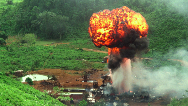 On s’en doute à l’avance : le pessimisme hargneux de Friedkin ne permettra pas de concrétiser cette utopie fraternelle et sociale. D’abord parce que les fugitifs n’ont aucune raison valable à employer l’entraide et la solidarité durant leur périple commun : pour eux, ce n’est qu’un travail à faire, avec un espoir hypothétique en bout de course, et non les prémices d’une amitié ou d’une quelconque révolution humaniste. Ensuite parce que leur réunion pour ce travail, déjà dangereuse en raison de leur statut de fugitifs recherchés, est en réalité bâtie sur un meurtre : Nino, qui n’était pas dans la même situation que les trois autres, aura été jusqu’à éliminer de sang-froid le quatrième membre de l’équipe afin de prendre sa place. Enfin parce que leur épopée motorisée à travers la jungle enchaîne les galères à la manière d’un effet boule de neige, de plus en plus grossissant : une cargaison de nitroglycérine menaçant d’exploser à la moindre secousse violente, une route montagneuse avec un vide vertigineux sur les côtés, une surface de bois fragilisée sur un virage serré, une carte routière pas toujours très claire, un gigantesque tronc d’arbre à faire exploser pour dégager le chemin, un groupe de guérilleros armés jusqu’aux dents, sans oublier la scène mythique du pont suspendu en pleine tempête, encore aujourd’hui inégalée dans le registre du tournage à risque (trois mois de tournage et trois millions de dollars rien que pour cette scène !) et de la logistique créativement infernale – sauf peut-être dans le Fitzcarraldo de Werner Herzog.