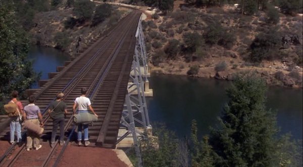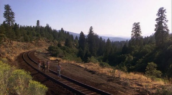 La mélancolie est donc non seulement ce qui fonde le passage du récit-cadre au flash-back mais également ce qui hante le récit enchâssé. Ces gamins sont pourvus d’une clairvoyance vis-à-vis de leur propre avenir, sont habités par une mélancolie précoce. Et tout particulièrement Chris qui s’avère être en quelque sorte chef de bande malgré lui : parce que son père alcoolique est connu de toute la ville, de même que son frère aîné, l’acolyte d’Ace Merrill, lui-même traîne une réputation de sale gosse, de terreur, qui en fait un leader tout choisi et naturellement craint. Lorsque l’argent du lait disparaît à l’école, c’est peut-être bien lui qui l’a volé – ça l’est en effet, mais il aimerait que l’on se pose la question un peu plus longtemps avant de l’accuser, que cela soit moins mécanique. Et que l’on cherche à aller plus loin, que l’on s’interroge sur la nouvelle jupe avec laquelle l’institutrice est arrivée en cours, quelques jours plus tard. Le voleur avait été volé. Lors d’une scène de confession nocturne entre les deux amis inséparables, Chris et Gordie, les gros plans sur les visages des jeunes acteurs saisissent tout le talent dont ils font déjà preuve. River Phoenix est carrément renversant lorsque son personnage évoque cette image si lourde à porter, qu’il n’a pas choisie. Ces gros plans, dont un autre film de kids tel que les Goonies est avare, signalent les ambitions dramatiques d’une œuvre qui dépasse nettement la simple aventure enfantine et innocente. Ils reviennent souvent saisir l’évolution profonde des protagonistes, traquer sur leur visage les symptômes de la perte de l’innocence. Ils offrent également des pauses dans le récit de la quête à proprement parler et octroient à ce dernier une certaine profondeur. Car, on le sait, chaque rencontre d’un obstacle, chaque découverte d’un paysage tellement grandiose qu’il en devient effrayant s’accompagne chez les héros autant d’excitation que de mélancolie. Face à un pont du chemin de fer au-dessus d’un immense gouffre, on pense autant aux risques que l’on encourt qu’au souvenir inoubliable que nous laissera, plus tard, le fait de les avoir surmontés.
