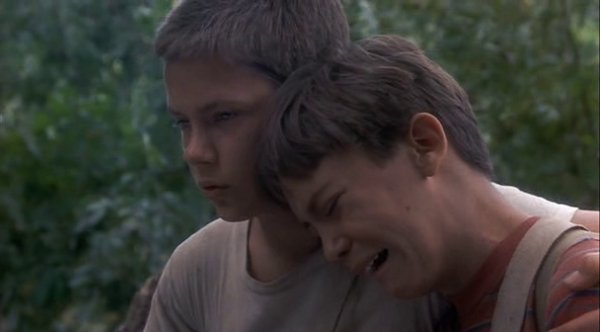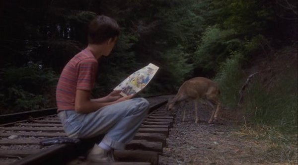 Plus évidemment encore, ce qui donne à chaque épisode de la quête des héros une résonnance plus mature, c’est l’objet même de la quête. Ils en prennent conscience un peu plus à chaque pas : c’est le corps d’un enfant que recherchent les acolytes ! Et tandis que Chris est atterré à l’idée que cette escapade soit non seulement la dernière de l’été mais aussi la dernière qu’il entreprenne avec son meilleur ami (celui-ci, il en est persuadé, est promis à des études au collège et à une belle carrière d’écrivain, tandis que lui-même ne se voit qu’apprenti, cloîtré à jamais dans la ville où il a grandi), Gordie est de plus en plus ramené à une autre mort que celle de Ray Brower : celle de son frère aîné, survenue quelques mois auparavant. Ce frère aîné, que John Cusack incarne dans les flashbacks, répondait bien plus que lui aux attentes d’un paternel peu aimant en excellant au football américain et en faisant craquer toutes les filles du lycée. Depuis ce décès, les parents de Gordie ne parlent presque plus et ont l’air de l’ignorer, et plus encore que du vivant de son frère, on lui fait sentir qu’il n’est pas « le bon fils ». A eux deux, Chris et Gordie convoquent la thématique toujours bouleversante de l’enfance en peine que le monde – autant dire celui des adultes – malmène sans chercher à la comprendre. Les parents démissionnaires ou irresponsables et l’institutrice criminelle sont des figures évoquées surtout dans les dialogues, la bande d’adolescents violents menée par Ace Merrill entrave physiquement l’itinéraire des héros. La nature aussi peut être un élément à affronter, plus imprévisible encore, lorsqu’il s’agit de traverser un gouffre vertigineux ou des marécages ou lorsque les cris des loups font trembler d’effroi les enfants installés autour d’un feu de camp. Mais la forêt convoque également l’imaginaire du conte et un soupçon de merveilleux : au petit matin, après une nuit riche en émotions, une biche s’approche doucement de Gordie dans un moment suspendu, presque fantastique, et pourrait bien être la matérialisation de l’âme du frère mort ou de quelque autre esprit bienveillant.