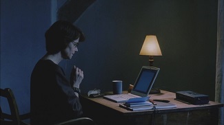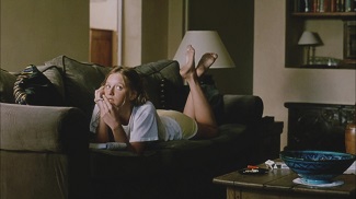 Mais avant l’immersion pleine et entière dans le huis clos, il faut tout d’abord en passer par la visite du lieu et des environs. Et là, déjà, ça commence à sonner bizarre. Plan après plan, le réel prend très rapidement des airs de rébus conceptuel. Le premier panoramique sur la façade de la villa a beau n’avoir rien de sorcier, la seule vision de ce lierre qui la recouvre à la manière d’une pieuvre ou d’une toile d’araignée nous fait déjà tortiller du sourcil. Même chose pour la suite de la visite, durant laquelle chaque action/geste/attitude de Sarah n’a rien de singulier en soi : défaire ses bagages, découvrir dans un placard une robe rouge que l’on range soigneusement, déballer un précieux matériel d’écriture (ordinateur et imprimante), observer depuis le balcon cette belle piscine recouverte d’une bâche, faire les courses dans l’épicerie d’à côté, se faire un petit plateau-télé, etc… Ces deux derniers points, a priori les plus anodins au sein du découpage, sont d’entrée ceux qui détonne le plus : on est bien content de savoir que Sarah adore boire du Coca Light et manger du fromage blanc 0% (la marque est par ailleurs toujours très bien cadrée), mais à quoi bon insister autant sur ce que Sarah mange, boit ou range dans le frigo ? La lecture psychanalytique doit-elle encore tout diriger, y compris les gestes et les fonctions les plus prosaïques du quotidien ? C’est surtout que le découpage est déjà un piège qui invite à fixer des détails – pleins ou creux – pour mieux guetter la matière – surface ou profondeur. Tout est, au fond, une question de filtrage : ne rien inclure au forceps (surtout le sens à donner) mais trouver le bon dosage pour ne rien exclure (dans un sens comme dans l’autre).