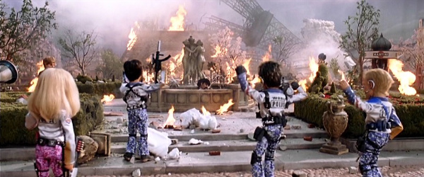 Cet espace-temps artificiel, assimilable à un plateau de cinéma conçu par un ignare en puissance, se révèle malgré tout sublimé par une mise en scène aussi précise que son découpage, épaulée en cela par le travail magistral de l’inattendu et talentueux Bill Pope (alias le chef-opérateur de Matrix !) qui fait tout son possible pour donner au film la prestance et l’efficacité d’un pur blockbuster. On le répète encore, la démarche de Parker & Stone consiste à faire preuve d’un entrisme des plus insidieux jusqu’à torpiller de l’intérieur leur propre cible. Et en cela, ils touchent sans cesse juste dans leur jeu de massacre des conventions, même lorsqu’ils s’adonnent à la citation cinéphile (les clins d’œil se comptent à la pelle) ou lorsqu’ils se contentent de décalquer les scènes-clés du blockbuster pour mieux les pervertir la seconde d’après. Par exemple, ici, pas d’écran noir une fois que les deux amoureux se sont échangé un baiser face au soleil couchant : le film montre frontalement ce qui se passe toujours « juste après », et tant pis si ça doit choquer les âmes sensibles. Preuve définitive que les deux auteurs, tout sauf imbéciles et irresponsables, ont tout pigé.