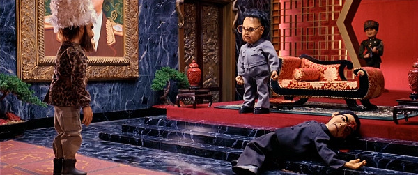 Ne pas se voiler la face, toutefois : Team America a été conçu non pas comme une parodie outrancière, mais comme un vrai film d’action hollywoodien, qui en reproduirait très précisément les codes les plus débiles (iconisation frimeuse, explosions en pagaille, héros tourmenté par un trauma, love-story à deux balles, etc…) tout en y incrustant une dose massive d’humour corrosif qui viendrait tout torpiller. Par ailleurs, le pitch, fortement perfusé à cette forme de paranoïa post-11 Septembre, est à la fois très simple et très représentatif du contenu idéologique de ce genre de blockbuster : une équipe de superflics américains (la fameuse « Team America ») traque le terrorisme sur l’ensemble du globe, et, au vu des dégâts collatéraux qu’elle accumule sur son passage, se retrouve sous le feu des protestations de pas mal de monde (acteurs, associations, gouvernements, etc…) tandis que Kim Jong-il ourdit un plan diabolique pour contrôler la planète. Faire des défenseurs d’une Amérique patriote et paranoïaque les « gentils » d’un tel film était un risque culotté, ici relevé avec un génie fracassant : là où certains s’énerveront de ne pas voir Bush et sa clique caricaturés avec autant de violence que chez ceux qui les combattent (preuve qu’ils n’ont rien pigé au film), l’astuce consistait justement à jouer du funambule entre le choix militant et la caricature sans pitié dans la pure retranscription des deux camps.
