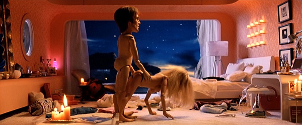 On l’avoue : avec tout ça, le mercure du délire atteint un sacré niveau. Mais on en oublierait presque de parler du véritable génie du film, à savoir sa mise en scène d’un film d’action à partir de marionnettes. Un geste assumé par Trey Parker à l’heure où l’animation 3D tend à monopoliser le terrain au profit de l’artisanal (une habitude chez eux : South Park était conçu à partir de feuilles de papier), mais aussi une arme de destruction massive dont on ne mesure pas la richesse sous-jacente. Tout d’abord, l’utilisation de marionnettes impose un retour bienvenu à une certaine forme de pantomime grotesque, misant tout sur l’impact des personnages dans un espace plus ou moins délimité et sur la violence qui en résulte. En cela, tout comme ce fut le cas dans la célèbre série Thunderbirds (l’inspiration première des cinéastes, of course), rien ne procure ici plus d’impact que lorsqu’une confrontation se termine par une déflagration : qu’il s’agisse de deux corps en plein combat (et encore, il s’agit plus de gesticulation que de chorégraphie), de deux véhicules qui se poursuivent à travers un paysage semé d’embûches ou d’une grosse explosion réduisant à néant le terrain d’action des personnages, tout concourt à un décalage permanent entre un burlesque très enfantin et une violence paroxystique. Sauf que Parker & Stone ne s’en contentent pas : comme le sexe et la violence forment aussi une large partie de leur marque de fabrique, ils n’hésitent pas à placer leurs Muppets chaudes au cœur d’une scène porno à rendre jalouse toute la profession du cinéma X, ou encore à renouer avec leur amour de la comédie musicale décalée (du heavy-metal nihiliste à la ballade romantique anti-Ben Affleck, on déguste chaud bouillant).
