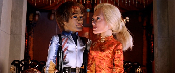 Le choix des marionnettes dévoile aussi une autre richesse insoupçonnée sur le terrain spatio-temporel. On le sait très bien : dans sa logique de récupérer les sujets et les idées à la manière d’un attrape-tout compulsif, Hollywood en arrive très souvent à intensifier les clichés par une méconnaissance totale des territoires qu’il filme, un peu à l’image de cette image (pas si faussée que ça, d’ailleurs) d’une nation prépondérante qui se révèlerait pourtant incapable de situer l’Albanie sur une carte. Ici, tout se précise dès la scène d’ouverture, située à Paris : un premier plan sur une toile peinte de la capitale avec une marionnette caricaturale qui gesticule en parlant un français pas possible (qui emploie encore aujourd’hui le terme « sacrebleu » ?), puis un zoom arrière qui révèle le véritable décor (à savoir exactement le même, puisque tous les personnages sont des marionnettes). Un sacré détournement d’un processus bien connu du 7ème Art, consistant à installer un cadre précis (le faux) pour en révéler par un effet de montage la globalité qui l’entoure (le vrai), un peu à la manière d’un emboîtement de poupées russes. Sauf qu’ici, tout est faux, parce que rien ne sonne juste : les acteurs sont des clichés ambulants et tenus par des fils bien visibles (et vas-y que je te sorte l’accordéon et les bérets-baguette fringués comme dans les années 20…) et les décors n’ont aucune crédibilité (la Tour Eiffel et l’Arc de Triomphe se partagent ici la même rue !). Beaucoup plus loin dans le film, la caractérisation des étrangers reflète là encore l’imbécilité des scénaristes d’Hollywood : un allemand à casque pointu, un russe au crâne plus petit que son ouchanka, un mexicain coiffé d’un sombrero XXL, et j’en passe…