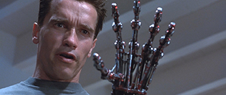 Sur la critique de la course à la technologie dans les deux Terminator, Cameron a toujours conservé la même ligne de visée : son regard s’est toujours porté sur la collaboration entre les autorités et la science, surtout avec les progrès technologiques entourant le nucléaire en guise d’arrière-plan. Et c’est au travers d’une simple idée narrative, glissée malicieusement dans les deux films, que sa colère anticonformiste s’incarne de façon percutante : à chaque fois, le « méchant » du film agit sous les apparences d’un représentant de l’autorité (dans le premier film, il conduit une voiture de police, et dans le second, il commet des meurtres en habit de flic), tel une créature de Frankenstein devenue autonome et lancée contre ses propres créateurs. Sur ce point, la scène la plus célèbre du premier film, qui voyait le Terminator défoncer l’entrée d’un commissariat (après avoir lâché son fameux « I’ll be back ! ») et exterminer un grand nombre de flics, apparaît aujourd’hui comme diaboliquement subversive. C’est la logique du capitalisme, engoncé dans une quête de profits sans aucune place laissée aux qualités humaines, qui conduit à chaque fois le monde à sa perte. Avec cette image du Terminator comme stade terminal de cet état d’esprit, impitoyable cyborg chargé de « terminer » les derniers vestiges de l’humanité dans un monde voué à la robotisation imminente. Le Terminator, c’est nous.