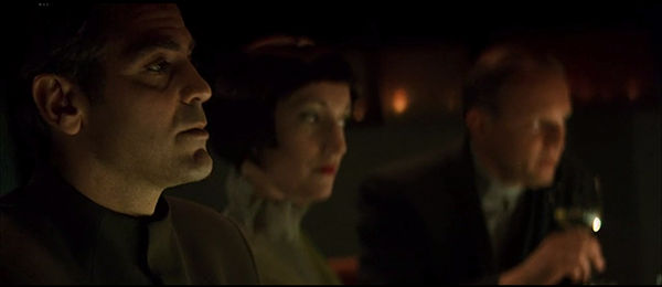 On peut ici parler d’un schéma lumineux en « split » c’est-à-dire que la moitié du visage est placée dans l’ombre tandis que l’autre est lumineuse. La particularité de cette scène est la symétrie des deux « split lighting » utilisés. Cette complémentarité montre un dialogue entre deux amants, amants qui sont aussi le médecin et le patient – on se rappelle que John Thackery a greffé à sa compagne un nouveau nez. Là encore, la gestion de la lumière par Soderbergh se veut absolument signifiante ; des personnages à distance l’un de l’autre semblent charnellement unis. Le lieu commun de l’âme sœur effleure notre esprit et l’on devine déjà qu’en perdant sa moitié, le chirurgien sera voué à une fin certaine. Ne pourrait-on pas qualifier ces plans qui condensent les topoï de distance, d’union et d’âme sœur de plans programmatiques ? Cette jeune femme symbolise pour John l’espoir de la guérison ; s’il a réussi le miracle d’apaiser ses fièvres et de lui greffer un nez sans rejet du nouveau membre, cette félicité sera de courte durée… On s’étonne d’ailleurs de voir le personnage dans un contexte romantique et jouant le jeu du bal mondain.