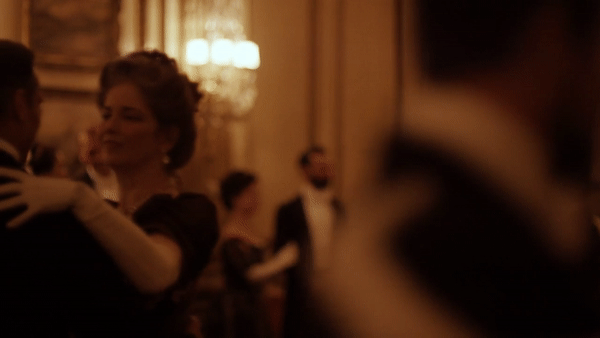 C’est caméra à hauteur d’homme qu’on suit les couples dans la salle de bal, ils commencent à danser et on navigue au milieu d’eux grâce à de lents mouvements sinueux. Le tournis s’empare de nous si bien qu’en quittant cette bulle, nous avons l’impression d’avoir pris part à la foule voire même d’avoir plané en épousant leurs pas de danse. Finalement, la steadycam s’élève et l’on surplombe la salle de bal, devenant une présence immatérielle qui observe ce petit monde évoluer comme un ethnologue étudierait une population mystérieuse. Plus tard, on se rapproche du sol pour suivre en contre-plongée Henry, ce qui nous permet d’apercevoir les jupons qui volent, d’entendre résonner fortement le son des pas sur le parquet. À hauteur d’homme, on peut voir les mondains traverser le champ, ce qui renforce l’impression de les épier. Nous épousons le regard d’un narrateur omniscient qui peut s’engouffrer dans la pièce qu’il a choisie et suivre les personnages de son choix. Tout dans ce plan-séquence respire la fluidité et on remarque même un travelling rotatif ou « panoramique inversé » qui permet d’encercler le microcosme mis en avant, car ici on dépeint bien une société comme si c’était une faune naturelle.