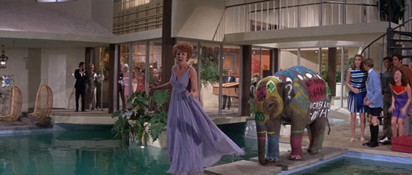C’est aussi de ce genre d’imprévu que naît le plaisir de savourer une majorité de gags dont Hrundi est à l’origine même s’il n’est pas présent là où ils se produisent : à titre d’exemple, celui de l’odeur de caviar qui passe de main en main est un chef-d’œuvre absolu. Et quand le processus est enclenché, Hrundi ne se force même plus et laisse le champ libre aux autres. Osons dire qu’il fait presque pâle figure face aux dégâts causés par le serveur Levinson, alcoolique compulsif qui boit en cachette tout verre de whisky refusé par les invités (on vous laisse imaginer son état au bout d’une heure de pellicule !) et qui multiplie les gestes aussi absurdes que mécaniques lors du dîner, tel un pantin démantibulé qui aurait perdu le sens des réalités. Quant au festival final, intégrant un orchestre russe, un groupe de hippies et même un éléphant peinturluré qui se promène innocemment parmi les invités (!), il contribue à lâcher pour de bon les rênes de la fluidité narrative, enfilant les doses d’hilarités comme des perles au sein d’un délire tous azimuts. C’est paradoxalement à partir de là que Blake Edwards atteindra un zénith dans l’art du gag métaphorique : cette présence de l’éléphant symbolise aussi bien le statut maladroit de Hrundi qu’une pique expédiée par le cinéaste aux hippies défoncés aux hallucinogènes. Personne n’est épargné dans le jeu de massacre…