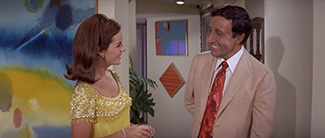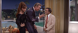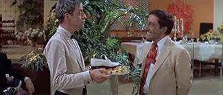Hrundi en fait lui-même les frais, surtout lors de la fameuse scène centrale du dîner où Edwards balance une idée d’anthologie : voyez comment le choix du siège (un tout petit repose-pied !) et la position de Hrundi (assis trop près de la porte battante de la cuisine !) schématisent en filigrane le manque de respect envers lui, d’autant qu’il n’était initialement pas censé être invité. En conséquence, le héros devient malgré lui le grain de sable qui fout en l’air la mécanique en même temps qu’il contribue très souvent à la rendre plus animée. Même en tentant de se familiariser avec toute cette smala de riches, notamment en se montrant poli et joyeux avec les invités, il semble toujours à côté de la plaque : soit son intervention est maladroite (après avoir ri à une histoire drôle racontée par un groupe, le voilà qui, par réflexe, rit à l’identique en écoutant l’histoire, pourtant tout sauf drôle, d’un autre groupe), soit sa présence devient gênante (il faut le voir interrompant sans arrêt une partie de billard afin qu’on lui explique les règles), soit son statut d’inconnu total le place en retrait du groupe. Quoique ce dernier point présente une nuance : son humour et sa sympathie finissent par séduire un célèbre acteur de western à la poigne d’acier, ainsi qu’une superbe actrice française, elle aussi un peu seule durant toute la soirée.