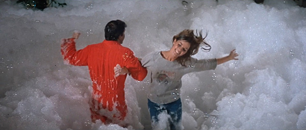 En somme, que du délire à l’état pur, que des fous rires en cascade, et rien d’autre ? Non, sûrement pas. Au vu d’une filmographie qui a pris un pied d’honneur à ne jamais sombrer dans le cynisme, l’optimisme et l’humanisme restent de rigueur chez Blake Edwards. The Party ne déroge pas à la règle en intégrant l’élément le plus risqué d’une comédie centrée sur l’hilarité non-stop : une histoire d’amour. En effet, si l’on peut souvent considérer Hrundi comme un enfant au vu de sa naïveté, il est loin d’être le seul à mériter cette assimilation. La jeune et douce actrice française (Claudine Longet) avec qui il sympathise est dans la même position que lui : désireuse de faire ses gammes en tant qu’actrice, mais considérée par un producteur véreux comme de la chair fraîche pliable à ses propres désirs ou échangeable en cas de refus. Et quand la tragédie semble frapper ces deux êtres fragiles, la fête est là pour remettre leur âme d’enfant sur le devant de la scène (dicton de Hrundi : « La sagesse est pour les personnes âgées, mais le cœur de l’enfant est pur »). D’où une explosion de joie où les deux, vêtus de fringues d’enfant à leur taille, dansent et jubilent comme des gosses au beau milieu d’un fatras psychédélique de bulles et de mousse. D’où, enfin, ce dialogue final d’un lyrisme chavirant qui signe leur séparation et annonce leurs futures retrouvailles. Le début d’une amitié réciproque, peut-être amoureuse, qui sait… Tout comme pour l’autre grand gaffeur de la soirée, ce serveur plus alcoolisé qu’un Depardieu perfusé au pastis pur, qui trouvera lui aussi l’amour dans les bras d’une nana encore plus beurrée que lui !