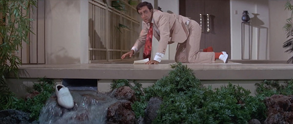 Cette idée de l’intrus qui dérègle la marche tranquille du monde n’avait cependant rien d’une nouveauté, tant les personnages de cartoon et les génies burlesques de l’époque (du genre Charlie Chaplin ou Buster Keaton) semblaient déjà avoir fait tourné la machine jusqu’à la rouille. The Party donne bien sûr l’impression de labourer à nouveau le même terrain, mais avec quelque chose que les comédies de l’époque ne possédaient pas : une épure stylistique à toute épreuve. Déjà, même en sachant que l’idée fut abandonnée dès le début du tournage (Sellers ayant décidé d’ouvrir la bouche dès la première scène), doit-on vraiment s’étonner d’apprendre que l’objectif initial de Blake Edwards était de réaliser une comédie muette ? Pas du tout, puisque The Party se révèle être un film de pure mise en scène, aux dialogues aussi minoritaires que les entrées de champ sont majoritaires, misant tout sur la mise en espace du corps dans le cadre et le simple déplacement des personnages au travers des différentes échelles de plan (chaque plan offre toujours une multitude de micro-détails à picorer). C’est l’art du gag visuel, où le dialogue n’intervient que lorsque la parole devient utilité narrative, et où le jeu épuré sur la scénographie devient force de loi.