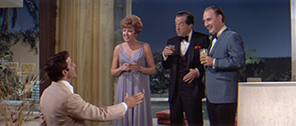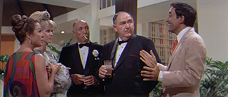Le temps que notre homme se fasse inviter par erreur à la fameuse soirée organisée par le patron du studio, Edwards poursuit à nouveau son entreprise de dézinguage de la galaxie d’Hollywood. La faune peuplant la villa luxueuse dans laquelle se concentre toute l’action est en soi édifiante, faisant se confronter les bourgeois les plus suffisants, les artistes les plus huppés et les stars les plus affligeantes. Remarquons tout de même un détail qui ne trompe pas : ici, hormis les employés et les serveurs, tous les invités se murent dans l’immobilisme, y compris lorsqu’un détail vient enrayer le cours tranquille des choses (même les musiciens ne bougent pas lorsque la maison est finalement envahie par de la mousse !). C’est un univers qui se fige dans son intolérance absolue et sa suffisance silencieuse, qui ne fait que rester sourd aux interventions incongrues, et qui, comble de l’hypocrisie, conserve son vrai point de vue aussi caché que possible en se soumettant à la politesse la plus mesquine.
