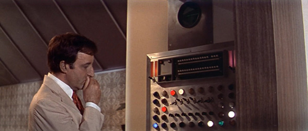 C’est là qu’il convient d’évoquer ce décor hallucinant, sorte de maison trop luxueuse et sophistiquée pour ne pas sembler suspecte ou propice au détraquage, où les perspectives géométriques sont à deux doigts d’évoquer un décor mental, où les escaliers en spirale longent de nombreux salons façonnés à la manière de l’art contemporain, où des passerelles en marbre surplombent de vastes ruisseaux artificiels qui se jettent dans une piscine. Sans parler du détail le plus frappant : la technologie est omniprésente dans cette maison, si l’on en juge par ce pupitre électronique où chaque bouton a sa fonction (bien sûr, on ne devine jamais laquelle) : ouvrir/rabattre les comptoirs, activer le micro dans toute la maison, booster le feu de la cheminée, intensifier le volume d’eau déversé par les fontaines, etc… Les inconditionnels de Jacques Tati auront bien sûr fait le rapprochement avec une scène culte de Playtime, mais s’il y a bien un film de Tati à rapprocher de The Party, ce serait plutôt Mon oncle, ne serait-ce que pour ces intérieurs ultra snobs et sophistiqués, ici enjolivés par la caméra d’Edwards comme terreaux d’une technologie incontrôlable qui les mènera à leur propre saccage.