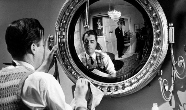Qui est attentif à ces fenêtres qu’ouvrent sans cesse les miroirs ou les tableaux du décor et à ce qu’elles révèlent des personnages saisit aisément toute l’ambiguïté sexuelle du film : ici, des dessins de corps masculins musclés nous sont révélés dans la chambre de Tony, là, le regard dur d’une photographie de quelque ancêtre militaire paraît fixer le jeune homme de manière désapprobatrice, comme pour condamner son attirance pour Barrett. Mieux, lors d’une scène où les deux hommes se recroisent par hasard dans un bar, leur positionnement dans le cadre s’inverse dès lors que Tony accepte de reprendre Barrett à son service : c’était donc encore à travers un miroir que nous voyions la scène, et ce brusque inversement de position signe un nouveau chamboulement de l’ordre hiérarchique : si Barrett revient au service de Tony, c’est bien lui qui le domine. Maître total de son image, véritable démiurge, Losey exprime partout, dans le reflet ou la déformation induit(e) par un miroir ou une ombre, l’altération de la perception du réel (autant dire la folie), l’aliénation d’un individu par un autre ou, mieux encore, la potentialité de cette altération, de cette aliénation. The Servant est ainsi marqué par un flou artistique revendiqué, ostentatoire et baroque, mais – disons-le – génial, qui, à mesure qu’on se laisse absorber par l’histoire, prend carrément des airs d’aura sublime. L’ambiguïté participe de la richesse de l’œuvre, qui combine dès lors les statuts de récit d’une déchéance psychologique, de fable sur l’homosexualité et de jeu de rapports de classes.