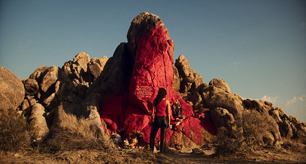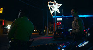 Il est tellement simple de penser ici aux effets secondaires produits par Twin Peaks The Return, tant les dix épisodes de Too Old To Die Young obéissent à la même logique : le monde que nous avions vu naître sous nos yeux et auquel nous nous étions habitués n’est plus qu’une terre désolée, sans autre horizon qu’un désert infini, où errent les mythes d’une humanité en ruine, ayant détruit ses utopies passées au profit d’un chaos tous azimuts et coupé son énergie interne jusqu’à suivre un mouvement de stase, pour ne pas dire de surplace. Le rythme est donc étiré au maximum, comme pour donner l’impression d’un monde qui tournerait au ralenti, et tous les individus qui le peuplent, en plus de laisser leur psychologie à l’état de feuille blanche (en gros, écrivez dessus ce que vous voulez…), sont réduits à leur fonction primitive de « corps », imposants et (im)mobiles. Dans un sens, leur autonomie hésitante rejoint assez bien celle des figures humaines de L’Année dernière à Marienbad d’Alain Resnais, où l’expression théâtrale d’une posture précédait une « action » que l’on finissait toujours par lâcher péniblement. D’aucuns diront que ces cadavres glam aux interactions superficielles ne font que singer la pose vide de sens et étirer sur cinq minutes des discussions qui pourraient être closes en trente secondes. Or, si l’on tente un comparatif en prenant par exemple l’insupportable dernier film de Céline Sciamma (un drame costumé d’un ennui à se pendre), on saisit bien que le néant enregistré par NWR n’installe pas la vanité et l’artificialité par souci de n’avoir rien à filmer ou à exprimer, mais cherche au contraire à les capturer par désir d’en extraire des états d’âme et des enjeux contemporains. Ce que l’on croit être une errance au cœur du vide a tôt fait de se révéler une immersion dans un espace méditatif et symbolique, où la disposition des choses dans le cadre envoûte et stimule mille fois plus qu’une exécution rapide des échanges.