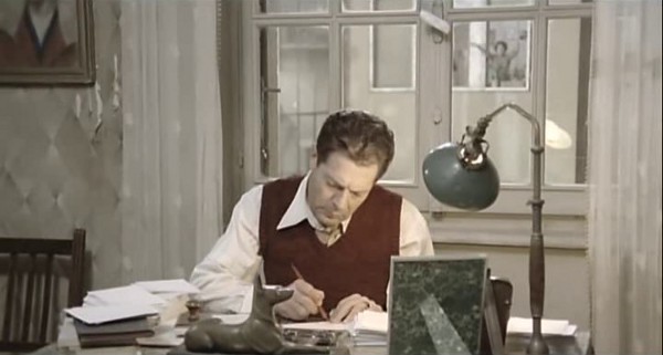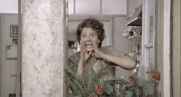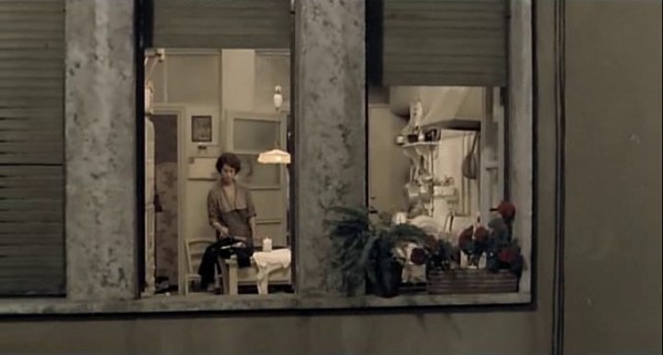 Dans l’immeuble romain déserté, il ne reste, outre la concierge, qu’Antonietta (Sophia Loren), une fasciste exemplaire, mère de famille traditionaliste et sans éducation, et Gabriele (Marcello Mastroianni), un intellectuel antifasciste, ancien chroniqueur à la radio mis à pied pour « défaitisme, déviance et tendances à la dépravation » – comprenez qu’il est homosexuel. Les deux personnages ne sont pas d’emblée présentés au spectateur en parallèle, ce qui annoncerait fatalement leur rencontre. C’est l’oiseau d’Antonietta qui, en s’enfuyant, provoque un nouveau pano-travelling dans la cour intérieure et fait entrer dans le cadre la fenêtre près de laquelle il se pose et à travers laquelle le premier personnage peut apercevoir le second. Laissée seule à ses lourdes tâches ménagères par son mari et ses six enfants, tous partis assister au défilé, la ménagère découvre l’existence d’un voisin, comme si elle avait vécu avec des œillères jusque-là et n’avait jamais daigné regarder par la fenêtre près de laquelle elle s’affaire chaque jour aux fourneaux (peut-être une évocation métaphorique de la sortie du mirage idéologique, si proche et si loin à la fois). Là encore, la mise en scène travaille l’espace – preuve que Scola sait convoquer les caractéristiques du théâtre sans pour autant négliger toute la richesse de l’art cinématographique – et suggère à la fois la proximité et la distance entre les deux personnages. L’ample mouvement de caméra qui suit le vol de l’oiseau décrit l’espace de la cour qui sépare les appartements respectifs d’Antonietta et Gabriele mais un plan rapproché qui montre Gabriele de face, occupé à son bureau, fait apparaître à travers la fenêtre située juste derrière lui la silhouette agitée d’Antonietta qui tente en vain d’attirer son attention depuis l’arrière-plan.