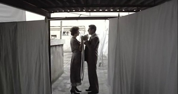 Cette idée du rectiligne, de l’unidirectionnel, on l’avait déjà dans les images d’archives de défilés militaires qui ouvraient le film, puisque l’itinéraire effectué par les troupes à travers Rome se réduit à la descente de quelques grandes boulevards tels que la via dei Fori Imperiali. A cela s’opposent les déplacements à répétition des deux personnages dans l’espace de l’immeuble et les mouvements aériens de la caméra qui traverse la cour intérieure et nous emmène d’un appartement à un autre. Si le décor renvoie sans cesse à la domination du régime, la manière dont le traversent Antonietta et Gabriele exprime un semblant de liberté. Pour autant, résumés sur un axe vertical, ces déplacements ne dessinent qu’un pic : les personnages partent de bien bas (elle, harassée par son travail ménager, lui, songeant au suicide) puis s’élèvent ensemble aussi bien symboliquement, en oubliant furtivement le monde qui les entoure, que littéralement, puisque l’acmé du film se situe indéniablement lors de la scène du toit-terrasse, avant de redescendre aussi bas, sinon plus bas encore… Si la séquence du toit-terrasse est le sommet émotionnel du film, c’est notamment parce qu’elle pousse loin le travail sur l’ambiguïté entre le proche et le lointain. Elle marque le premier rapprochement physique et sentimental des personnages, mais également la révélation d’une barrière sexuelle à priori infranchissable. Avant que l’homosexualité de Gabriele soit explicitée par les mots (dans un dialogue déchirant où Antonietta le poussera à expliquer la chose avec des mots toujours plus simples et directs, faignant de ne pas comprendre comme pour se laisser le temps de se faire une raison), le quiproquo est remarquablement figuré par la mise en scène. A ce moment du film, les rumeurs du défilé sont légèrement atténuées et l’omniprésence du blanc du linge étendu ainsi que le bleu du ciel renforcent l’impression d’un instant suspendu où une évasion du monde alentour serait possible.