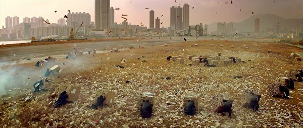 Le code inébranlable du polar d’action HK, qui aura d’ailleurs permis à Johnnie To de chiper sans difficulté le trône longtemps dévolu à John Woo, reste bel et bien le gunfight. On en compte ici trois, inoubliables à bien des égards. D’abord une sidérante scène de confrontation au clair de lune, permettant à To de renvoyer toute la concurrence à sa cour d’école par une maîtrise de l’espace tout bonnement estomaquante : un lieu précis qui tranche radicalement avec le territoire urbain (un parc aux allures de sous-bois surnaturel), un espace délimitant la mise en place des forces en confrontation (deux tables de pique-nique, l’une pour Costello et ses trois amis tueurs de Macao, l’autre pour leurs trois cibles de Hong Kong qui mangent avec leurs familles), une technique de l’élastique alimentée par l’aller-retour d’un objet servant d’abord de signe avant-coureur puis de coup d’envoi (un simple boomerang qui passe d’une table à l’autre, avec une trajectoire magnifiée par le ralenti), un déluge de feu traité comme un ballet où les forces de la nature – surtout le vent et la lune – ne cessent de freiner et de brouiller les repères des silhouettes (rien de mieux pour refléter l’épais brouillard mental dans lequel évolue Costello). Ensuite l’inévitable passage sacrificiel que le genre exige, ici topographié dans une hallucinante décharge publique où des vents surnaturels balayent encore plus de détritus que de feuilles mortes chez Bela Tarr, et où le trio d’exécuteurs rejoue soudain le final mythique de La Horde sauvage de Sam Peckinpah face à des ennemis avançant vers eux avec des ballots de papiers comme boucliers. Enfin une admirable fusillade sous forme de fuite verticale sur la façade d’un immeuble rempli d’ennemis surarmés, qui amplifie en à peine cinq minutes toute la tension qui parcourait l’immeuble assiégé de Breaking News sur plus d’une heure. Trois scènes démentielles qui, chacune à leur manière, sont guidées par le même fil directeur : la conscience d’un irrémédiable effondrement. Quand bien même elle débouche constamment sur des confrontations explosives où le chaos redevient le seul langage audible, l’action chez Johnnie To n’obéit toujours qu’à un désir d’effritement préalable de tout ce qui le prépare : l’épure stylistique du cinéaste prépare le terrain, son sens foudroyant de l’espace et du mouvement mène ensuite la danse. Les vivants et les morts ne font que jouer la même danse, forces en action, fragilité en suspens.