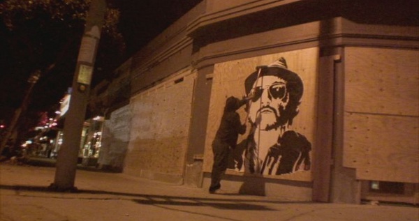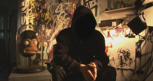 Et le voilà donc qui se jette corps et âme dans cette forme d’art considérée comme hors-la-loi par les autorités, dans laquelle il va rapidement trouver un exutoire à sa passion absurde, et qui, de fil en aiguille, à force de percevoir le moindre potentiel artistique dans tout ce qui l’entoure, le poussera malgré lui à conférer au street-art une valeur marchande inattendue. C’est à travers ce regard posé sur un art piégé par son propre succès que Banksy abat sa carte maîtresse : si le street-art est à la base un art sans règle ni étiquette, sans langage ni définition, comment appréhender le fait que son statut ait été récupéré de façon aussi commerciale, et surtout, quel est son réel impact ? Ne pas croire que le film va se limiter à la peinture d’une sensibilité artistique dévoyée ou à la critique acerbe d’un monde de l’art devenu aussi snob que stupide (le film s’amuse quand même à dénigrer les chantres d’un « art authentique » comme des imposteurs ou des naïfs, ou à stigmatiser l’institution de l’art comme une hypocrisie à visage découvert), la réflexion va bien plus loin que le simple point de vue d’un auteur masqué qui pose un regard pince-sans-rire sur l’art qui l’a rendu célèbre. Très conscient de l’ambiguïté que ne manquera pas de soulever son film, Banksy brouille les pistes et abat toutes nos certitudes.
