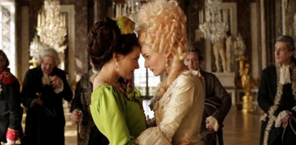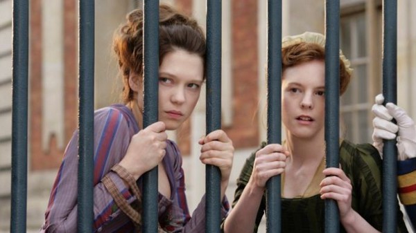 « 14 juillet 1789 », nous indique-t-on d’emblée. Une jeune femme se lève en sursaut. La modestie de sa chambre, ses cheveux en broussaille, la sobriété de sa tenue n’y font rien, ne déterminent en rien un statut social qui l’enchaîne : une fois qu’elle regarde l’heure sur la pendule luxueuse que quelque noble lui a offerte, l’importance de sa mission détermine son apparence – si possible irréprochable, et c’est à grands pas qu’elle marche le long des couloirs de Versailles, tantôt souterrains et méconnus, tantôt souverains, ornés de glaces et de lustres majestueux. Pour Sidonie (Léa Seydoux), il n’importe plus que d’aller au chevet de celle dont elle est la lectrice, de celle qu’elle respecte plus que quiconque, de celle qui, plus encore, exerce sur elle une fascination sans pareil : Marie-Antoinette. Dès les premiers instants des Adieux à la Reine, le réalisateur Benoît Jacquot déjoue les attentes de son spectateur. Combien de films ont déjà été tournés à Versailles, rentabilisant du mieux qu’ils peuvent la location des décors en question par des plans d’ensemble récurrents, par une logique d’exploitation des pièces les plus connues (Galerie des Glaces, etc.) qui confine au livre d’images touristique ? Ici, ce que pose très tôt et très clairement Jacquot, c’est son parti-pris de raconteur d’histoire et de metteur en scène : peindre l’avènement de la Révolution Française non seulement sur une très courte période (du 14 au 17 juillet 1789) et depuis le seul intérieur de Versailles – ce qui aurait déjà été original – mais, plus spécifiquement encore, du point de vue d’un personnage que l’Histoire n’a pas retenu. Les jump cuts récurrents, qui nous font suivre une Sidonie pressée le longs des couloirs des différents étages qu’elle doit gravir pour aller au chevet de la Reine, expriment parfaitement l’idée que seul le personnage compte, son obsession, et pas tant le monde qui l’entoure et qu’il a tendance à ignorer ou à mal saisir. Benoît Jacquot filme son héroïne et ceux qu’elle côtoie au plus près des corps, attentif aux regards ou aux déplacements qui suffisent à dire beaucoup. Ainsi de cette première séquence de lecture, où déjà le jeu de regards entre les différents personnages pose les bases de ce qui suivra : Sidonie observe langoureusement la Reine, tandis que Madame Campam, une dame de compagnie jouée par Noémie Lvovsky, surveille d’un air inquiet l’attitude de la lectrice. Plusieurs fois, les déplacements de Sidonie seront marqués par des chutes, sur le sol glissant des longues galeries du château : voilà un élément mine de rien frappant qui rompt avec les mises en scène éculées de la vie à Versailles, ultra-réglées pour peindre un monde lui-même cadenassé.