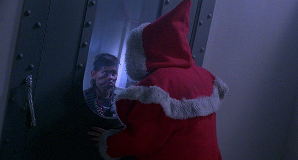 La personnalité de son réalisateur a déjà un poids certain dans les quelques aprioris que l’on peut poser sur 3615 Code Père Noël. Encore aujourd’hui, la carrière française de René Manzor serait plutôt du genre à nous donner envie de faire la grimace : après un inénarrable nanar où Alain Delon mettait une raclée à la Grande Faucheuse (Le Passage) et un univers de poupée Barbie très mal déguisé en love-story onirico-fantastique (Un amour de sorcière), on avait cru à un vrai miracle en savourant l’excellent Dédales, petit bijou de manipulation narrative autour du thème de la personnalité multiple. Mais on doit également au bonhomme un passage très remarqué par la télévision (surtout aux Etats-Unis, où son travail impressionna Steven Spielberg et George Lucas), le tournage de clips (notamment ceux de son frère Francis Lalanne) ou l’écriture de romans (on lui doit à ce jour trois thrillers impeccablement structurés). 3615 Code Père Noël est à ce titre un film de transition, permettant à Manzor de quitter sa traversée du désert suite au succès commercial du Passage et de délaisser le montage de bandes-annonces pour ses confrères afin de revenir sur le devant de la scène. Et dans cette idée de concevoir un film ambitieux avec un budget relativement faible, il choisit pour le coup de s’intéresser à la psychanalyse de l’enfance (le film s’ouvre par une citation tirée de La Psychanalyse des Contes de fées de Bruno Bettelheim) en la traitant par un mélange hybride de conte et de terreur. D’où cette histoire d’un enfant surdoué de neuf ans, fan d’informatique et de culture geek, dont la croyance pourtant enracinée dans la magie et le merveilleux va être mise à très rude épreuve lorsqu’un psychopathe déguisé en Père Noël s’introduit chez lui le soir du réveillon.