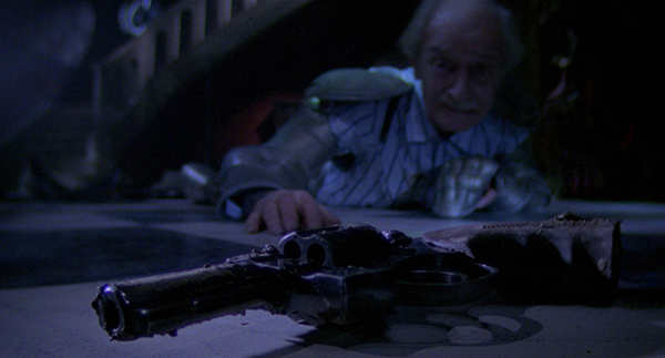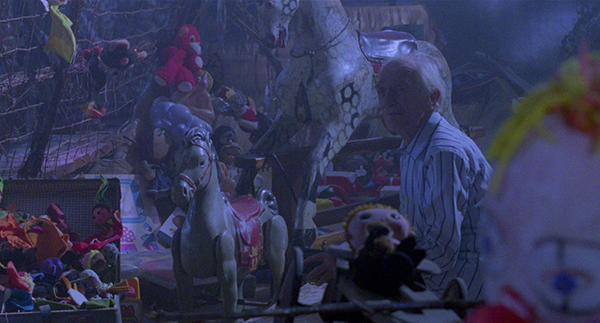 Faisons un peu le tour. Déjà le jeune héros capable de recourir à sa ruse et à sa malice pour se défendre contre un intrus : sur ce point précis, Macaulay Culkin faisait des ravages là où Alain Musy peine à imposer un arc psychologique très clair (il faut le voir basculer brutalement du calme posé à la trouille chialeuse d’une scène à l’autre !). Ensuite ce concept d’un enfant qui utilise sa maison comme un terrain de jeu : on peine ici sérieusement à croire à une bâtisse pareille, remplie de caméras et de trappes en tous genres, shootée de l’extérieur par le biais d’une maquette pseudo-gothique à la lisière du hors-sujet, et blindée d’une topographie très borderline (où se situe réellement cette vaste pièce remplie de jouets ?). Enfin cette idée d’une menace charismatique qui saurait faire autant rire que frémir : tandis que Joe Pesci et Daniel Stern roulaient joyeusement des mécaniques pour mieux finir par se prendre les pieds dans la mécanique, le regretté Patrick Floersheim rame sérieusement à incarner une menace dans la mesure où Manzor a choisi de l’humaniser dès le départ. En effet, loin d’un proto-Michael Myers dont la simple posture suffirait à glacer le sang, ce boogeyman est visualisé dès la première scène du film comme un banal SDF à la lisière de l’autisme, sans doute triste de n’avoir jamais su quitter le monde de l’enfance, et dont la solitude devient signe d’empathie chez le spectateur jusqu’à la fin. Grave erreur que voilà : il est évident que la peur et la rigolade sont ici vouées à s’évaporer.